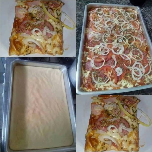 Tire e espalhe molho de tomate e recheio de sua preferência (use molho pronto, presunto, cebola, mussarela, tomates e azeitonas.